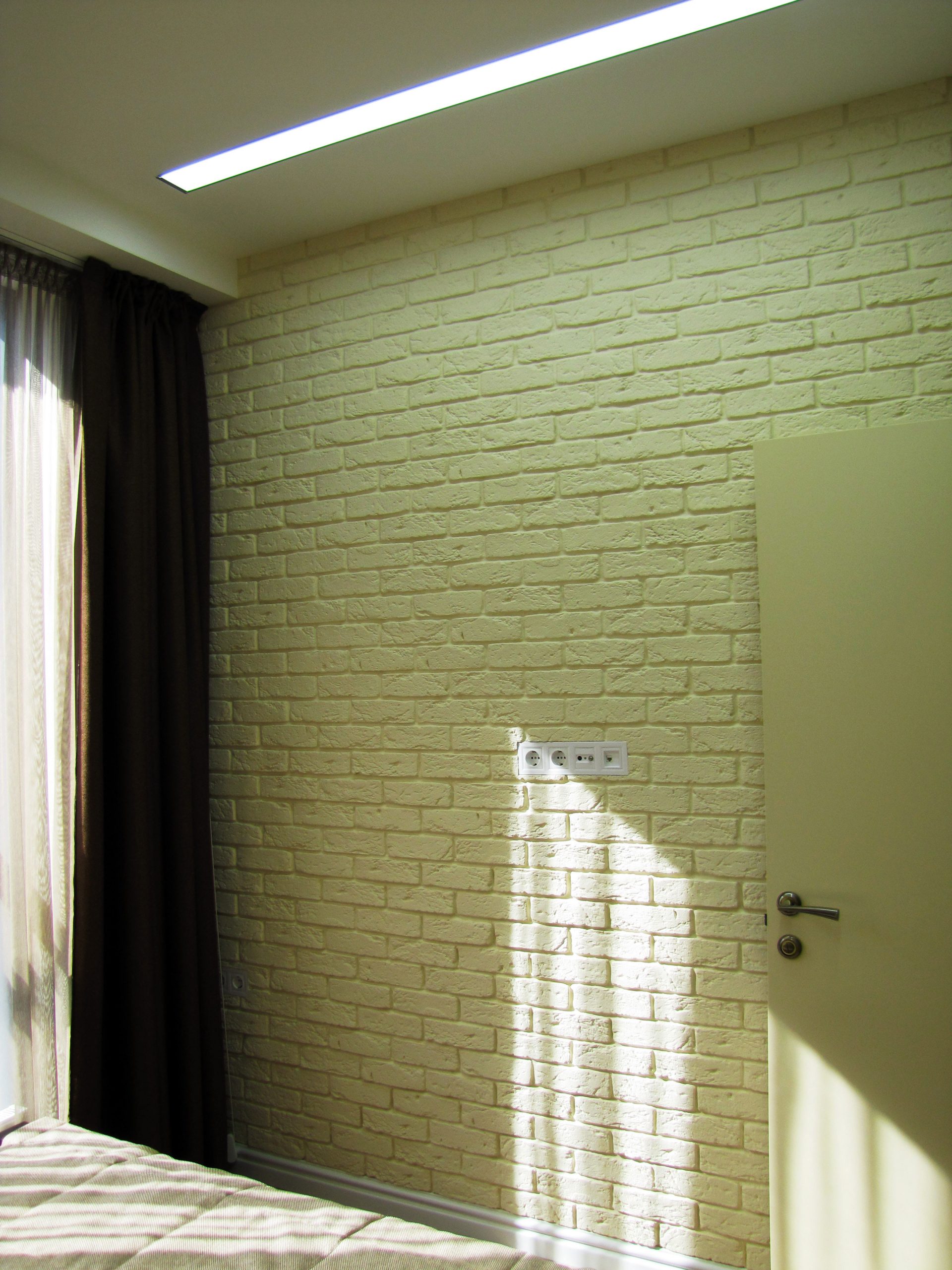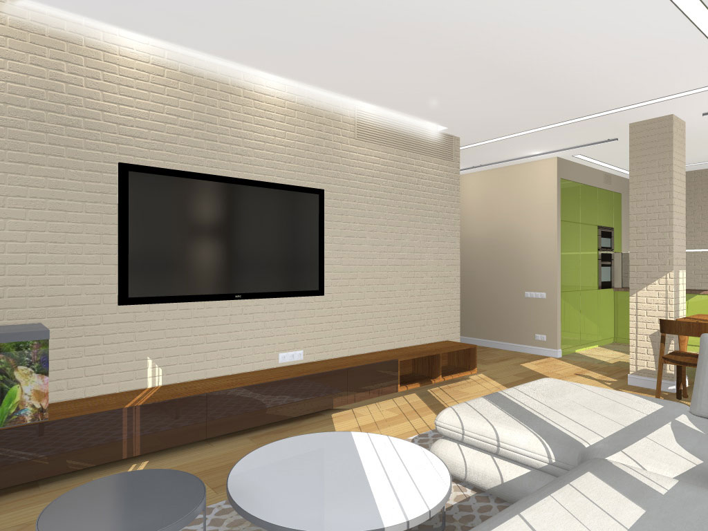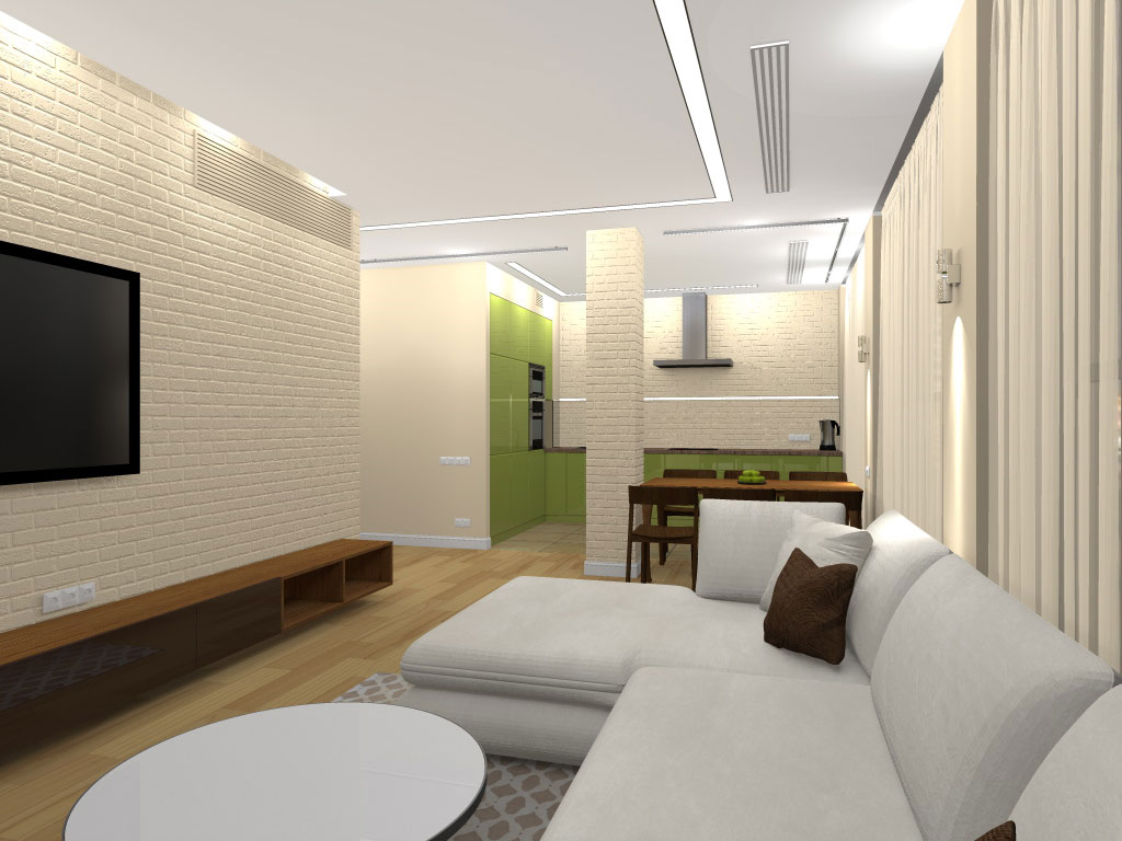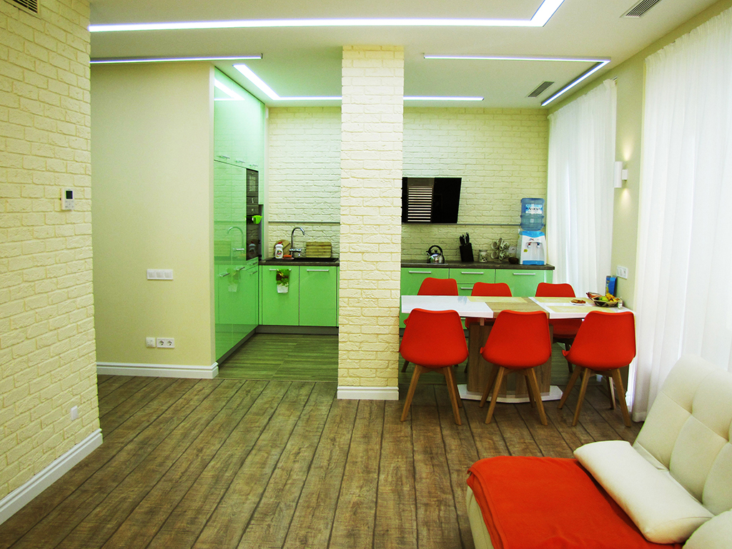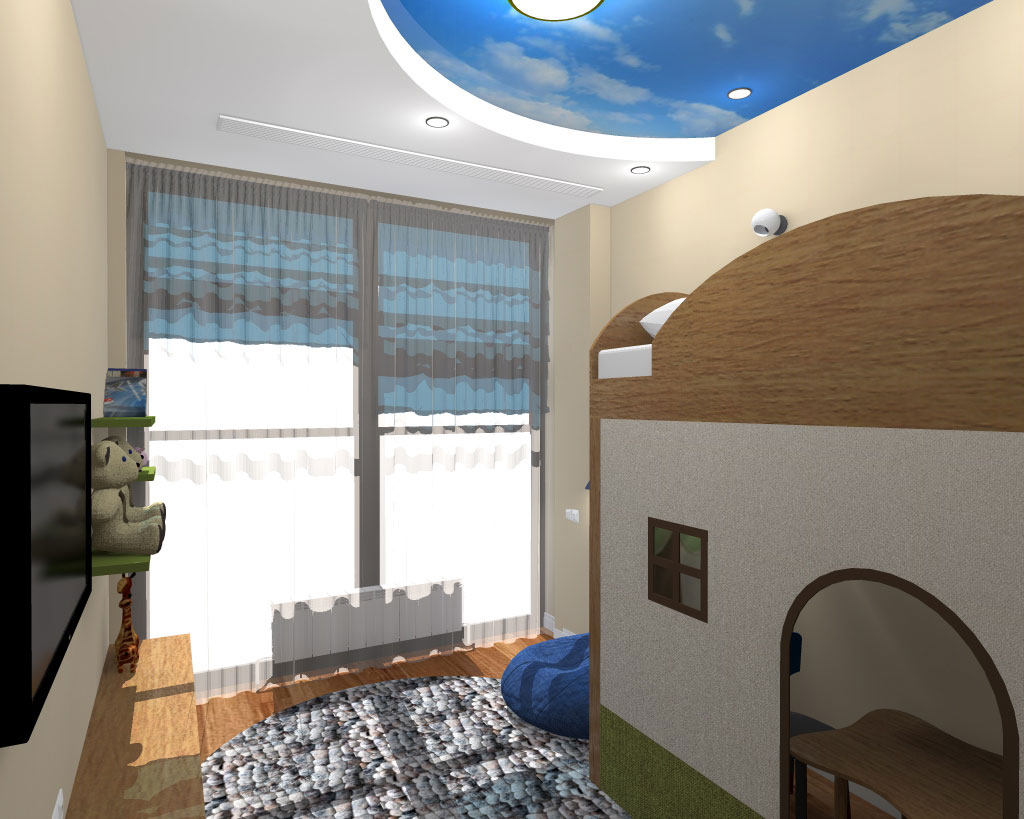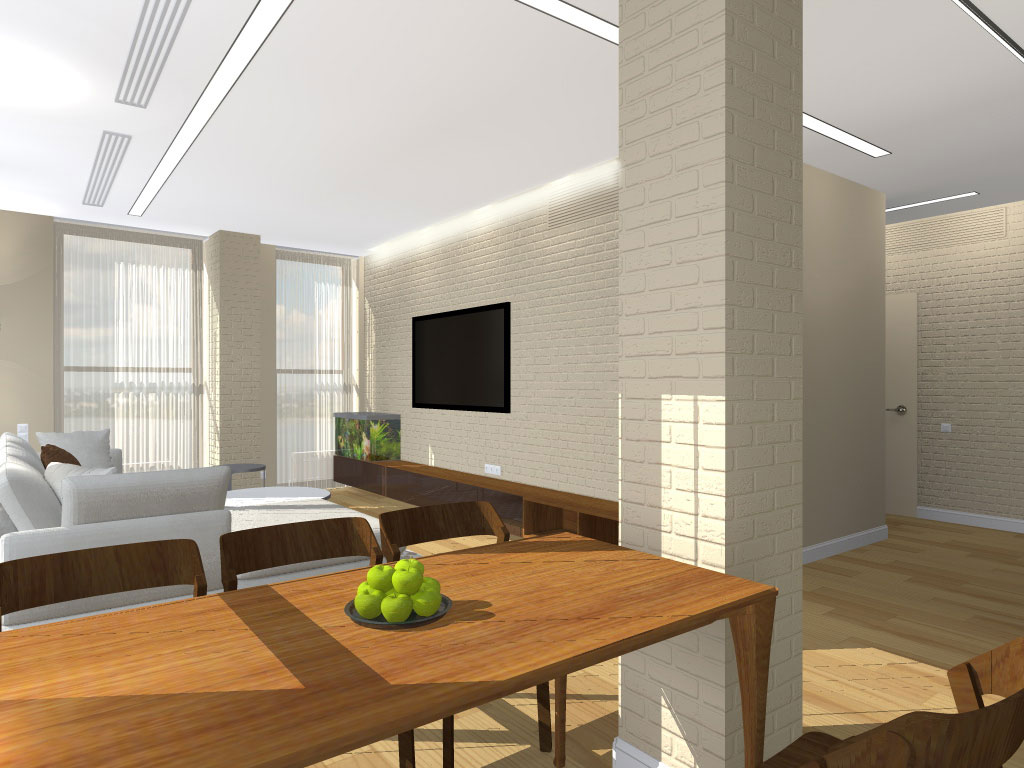 На порівняно невеликій площі необхідно було розмістити студію з кухнею та обідньою зоною, господарську спальню, дитячу, гостьовий санвузол і майстер-ванну, пральну кімнату та гардероб. Суворий функціоналізм, проста геометрія ліній, світла кольорова гама та акценти на фактурах – основні побажання замовників. У дитячій господарі просили створити ефект казкового світу.