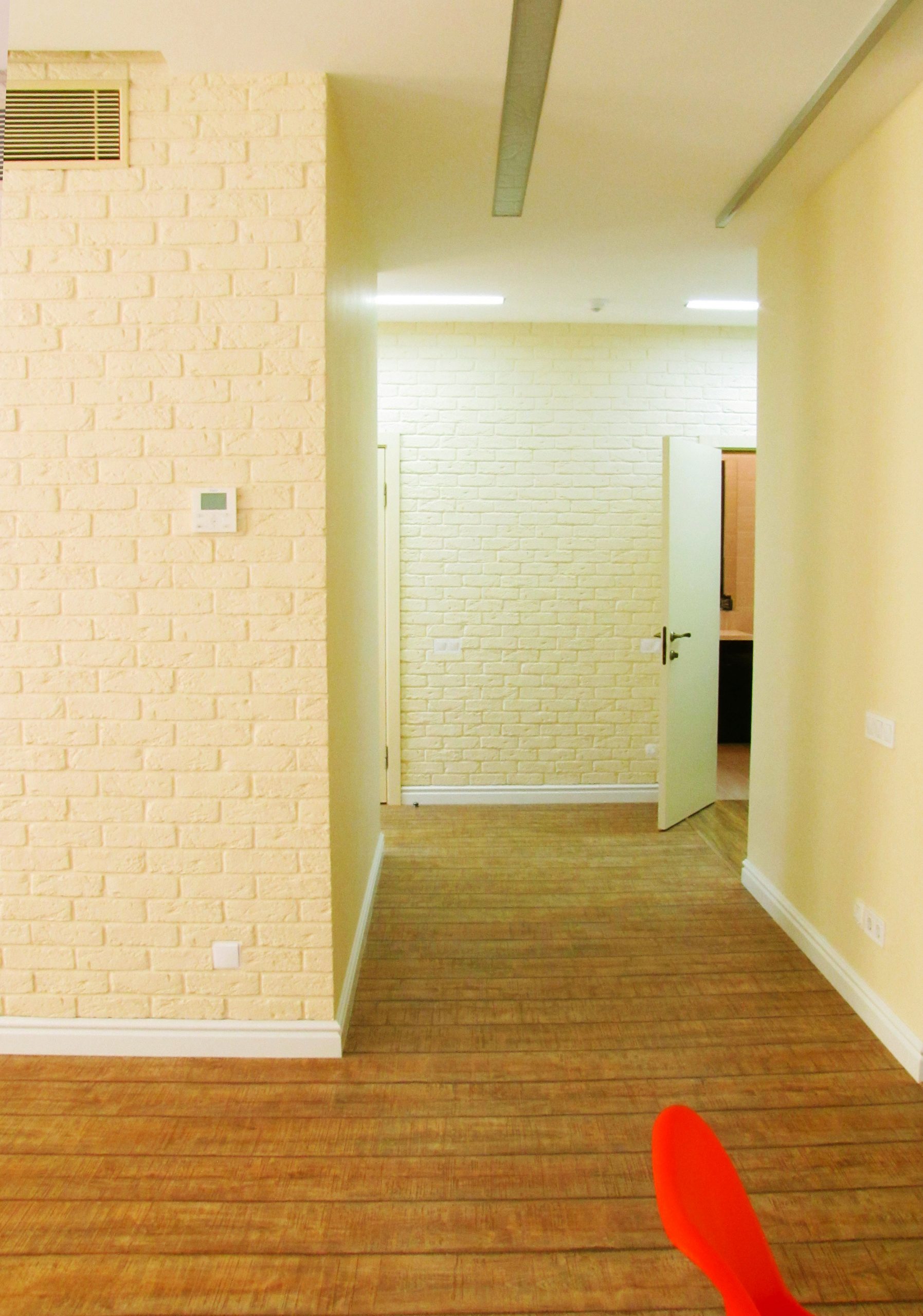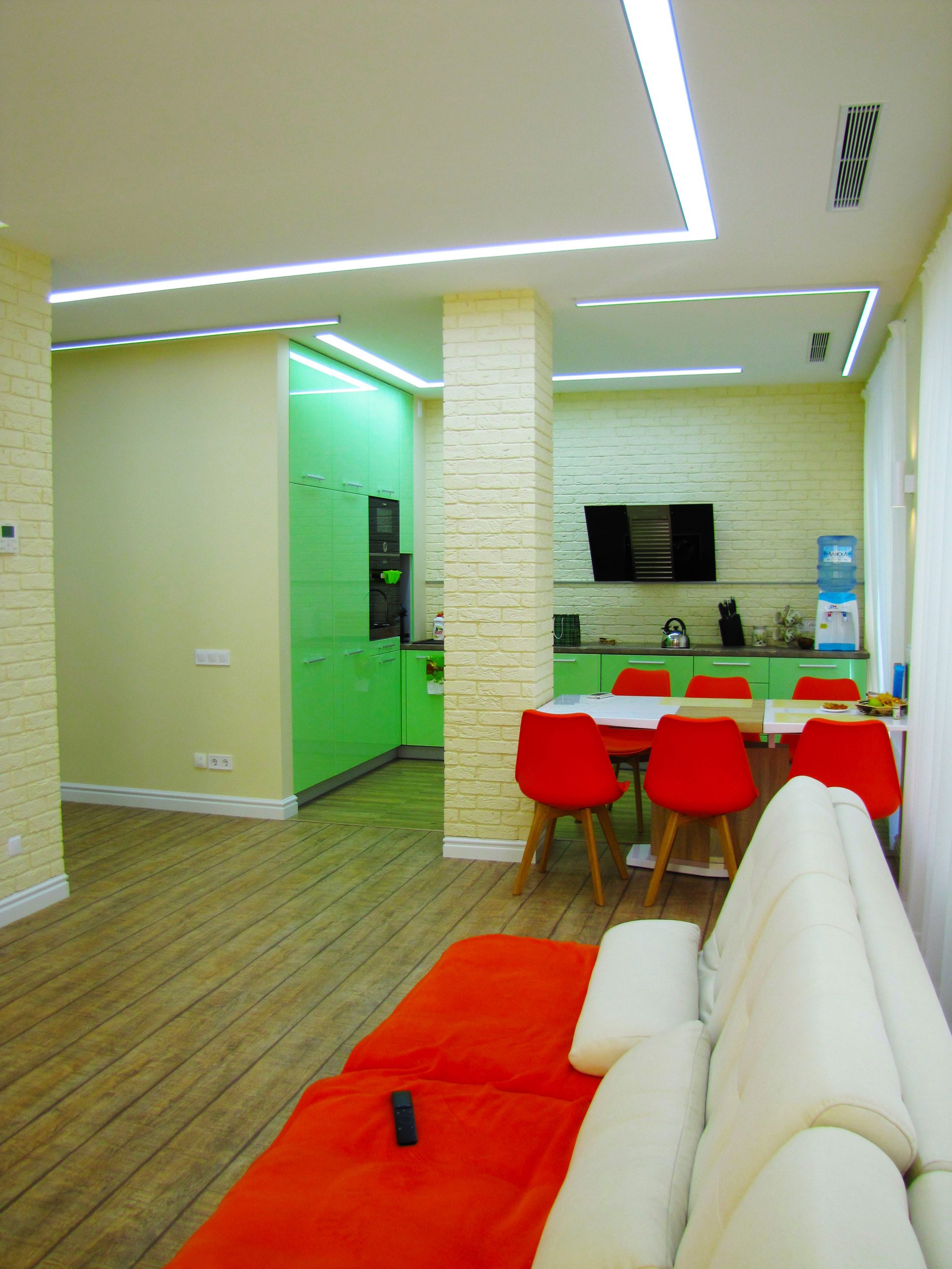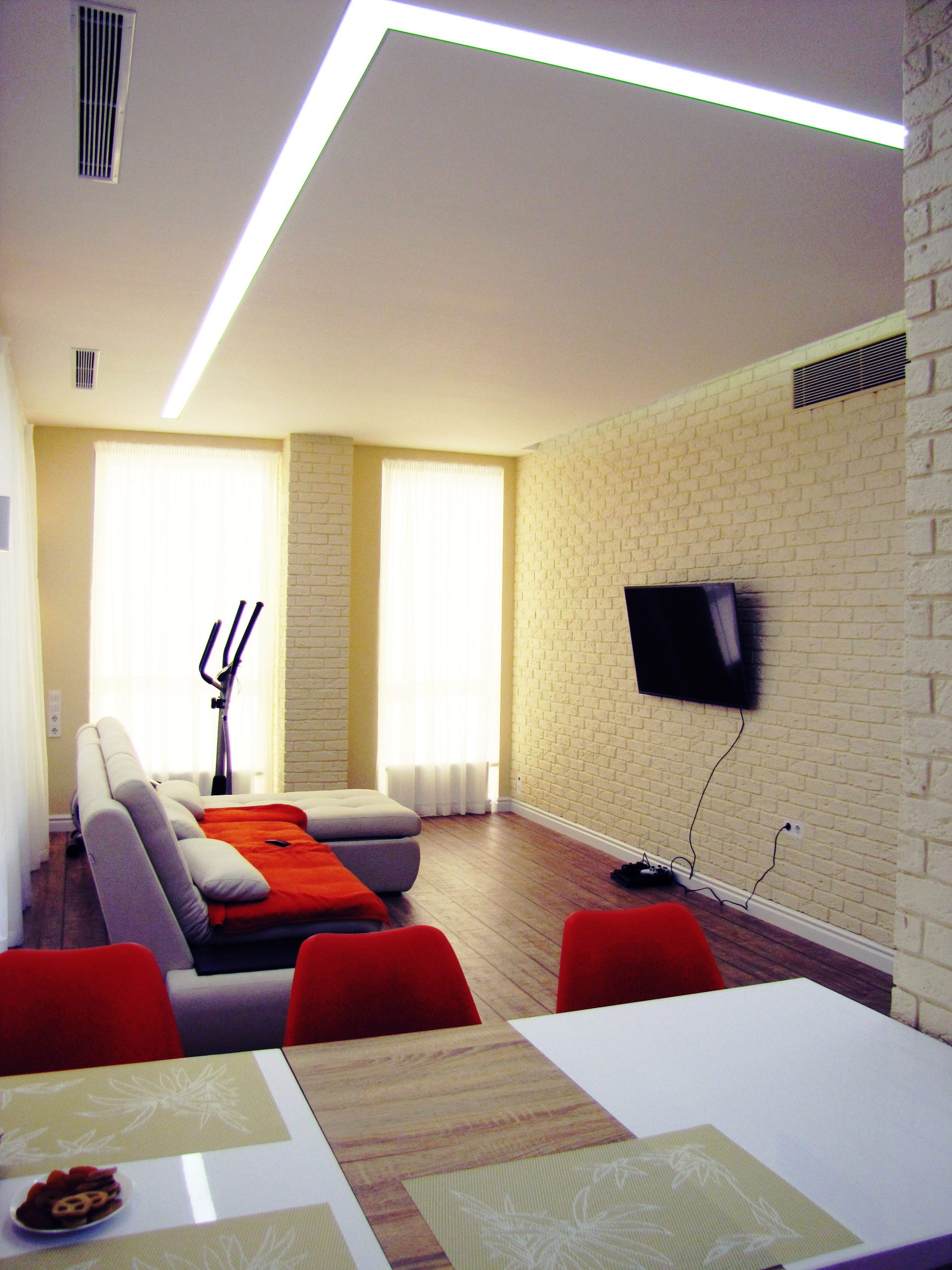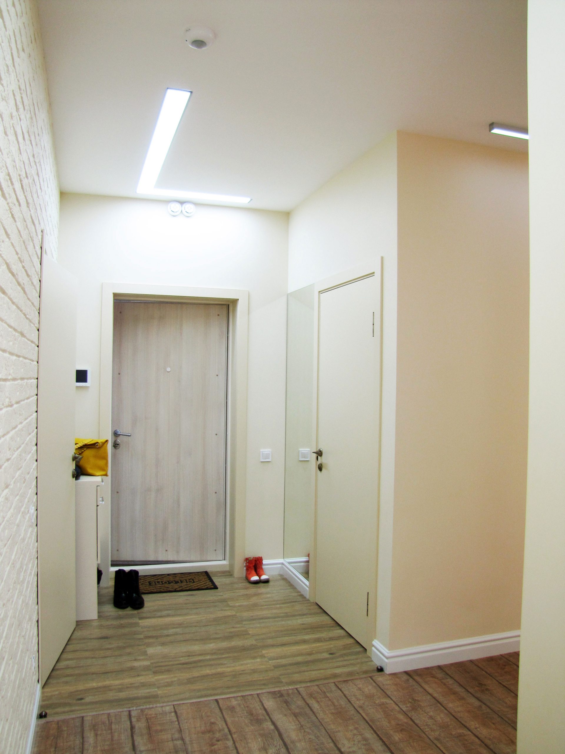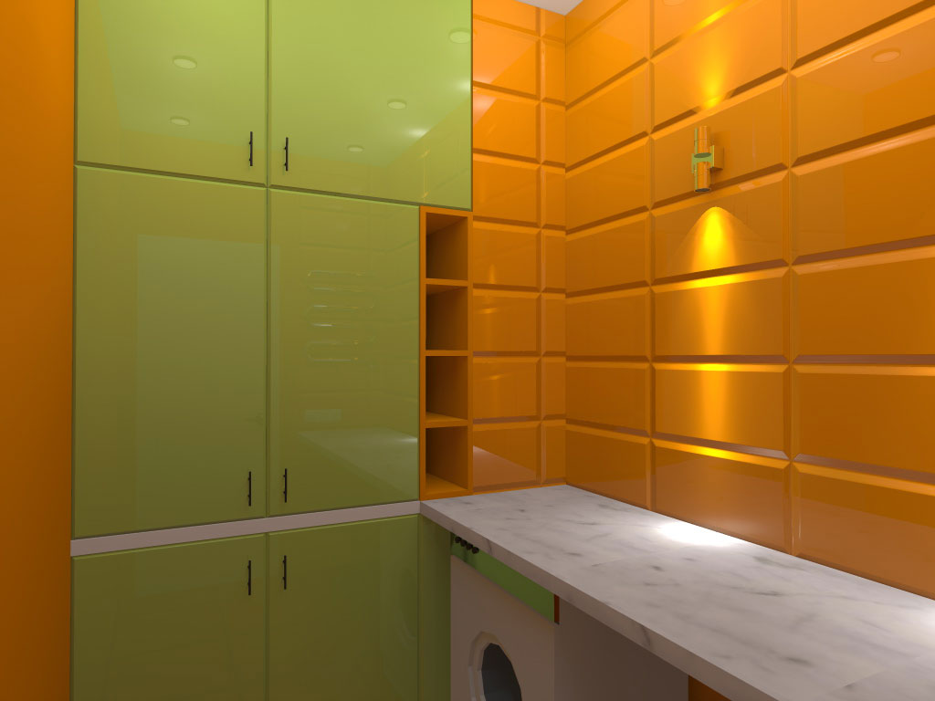 На порівняно невеликій площі необхідно було розмістити студію з кухнею та обідньою зоною, господарську спальню, дитячу, гостьовий санвузол і майстер-ванну, пральну кімнату та гардероб. Суворий функціоналізм, проста геометрія ліній, світла кольорова гама та акценти на фактурах – основні побажання замовників. У дитячій господарі просили створити ефект казкового світу.