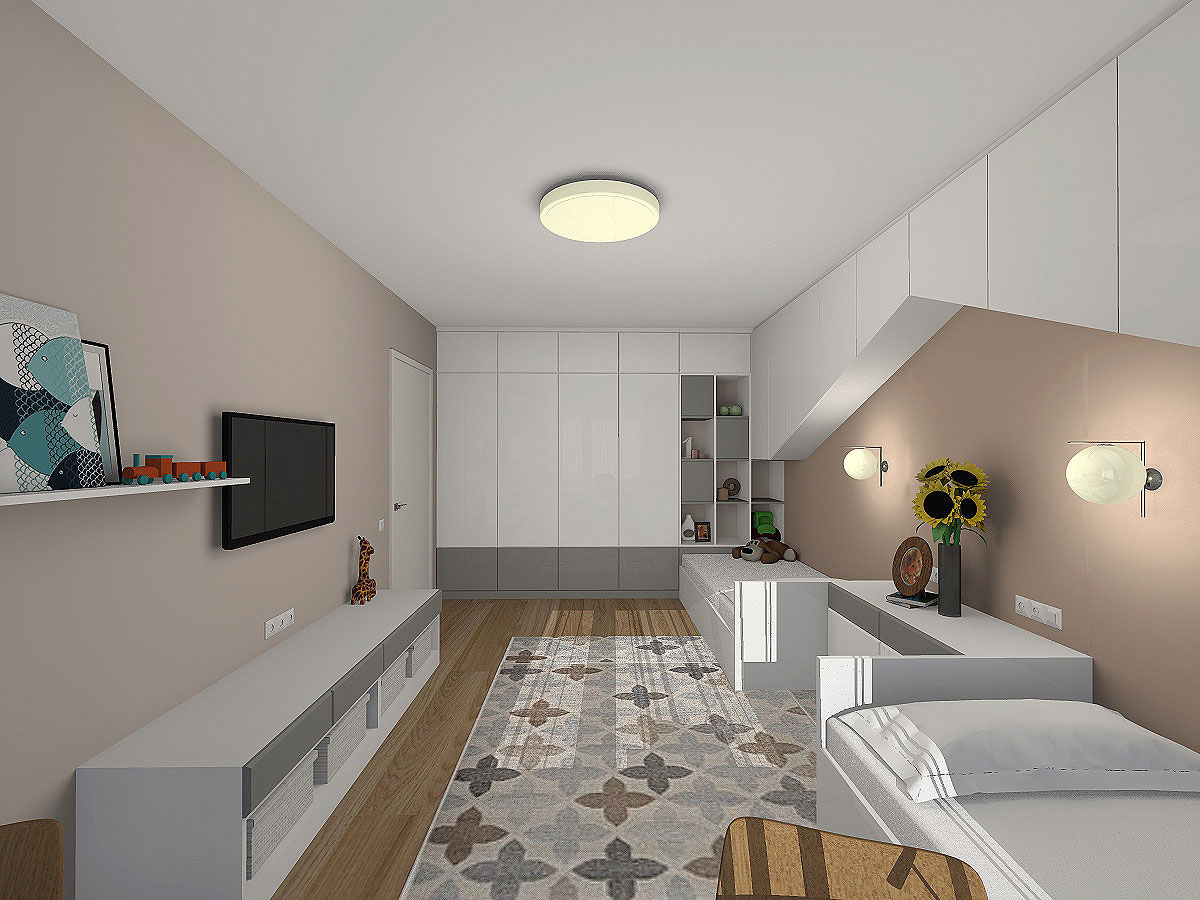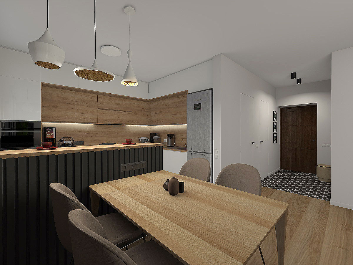Свіжий, сучасний мінімалістичний інтер’єр, розроблений для молодої сім’ї з двома малюками. Ми розбили приміщення на загальну та приватну зони. У загальній зоні розмістили студію і ванну, а також невеликий санвузол. У приватній зоні розташовані господарська спальня і дитяча. Кімнати ізольовані за допомогою маленького холу, де знайшлося місце і для невеличкої вбиральні.