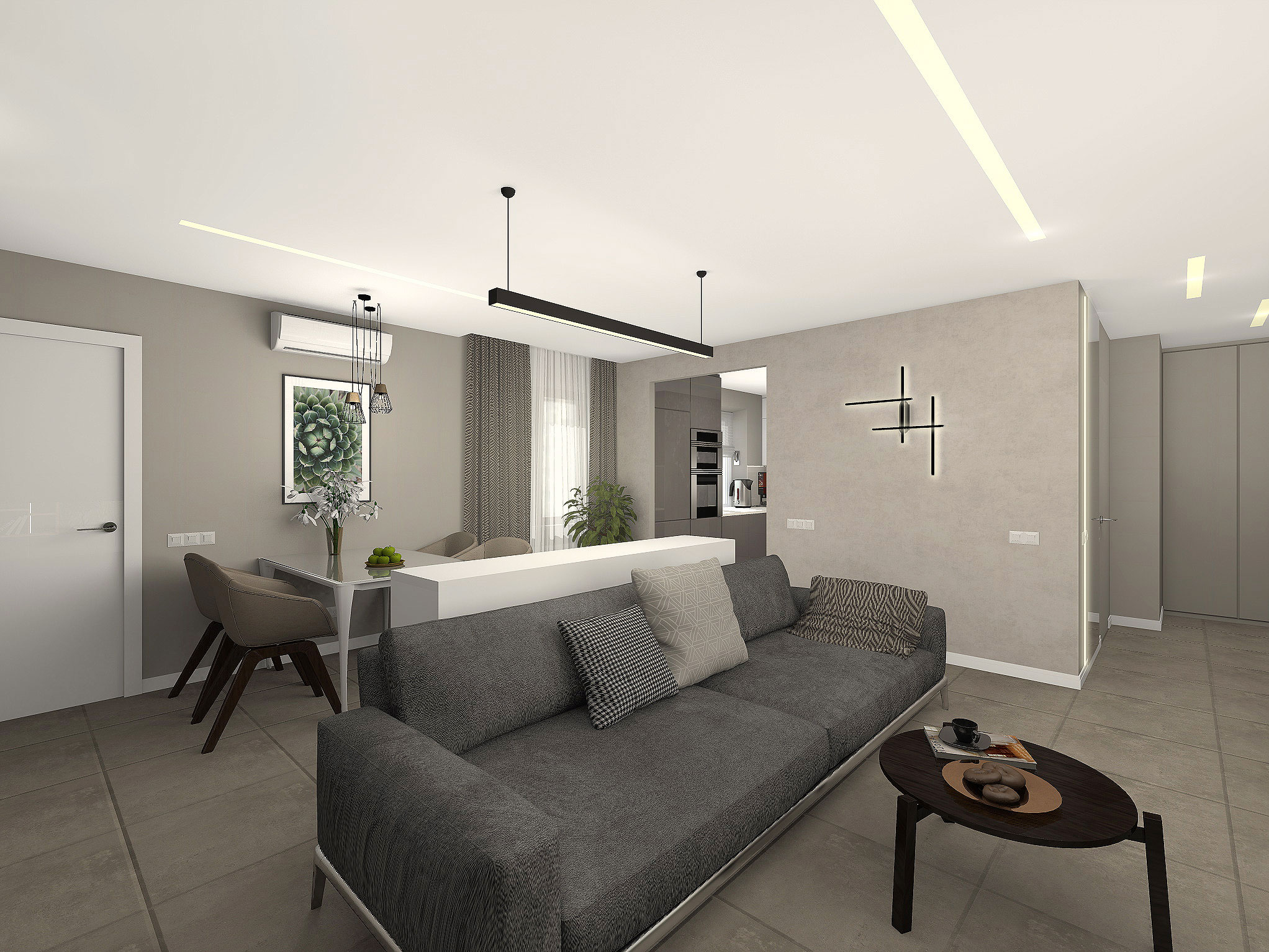 Знайомтеся: це наш абсолютний лідер серед монохромних інтер’єрів! Звичайна трикімнатна квартира в панельному будинку порадувала господарів і нас дуже вдалим плануванням. Ми знесли всі перегородки, які можна було знести, внаслідок чого отримали можливість створити цілком функціональну й ергономічну кімнату для доньки, дуже містку вбиральню і ванну, функціонально зоновану кухню та досконалу з точки зору ергономіки вітальню. Пісочно-сіру палітру освіжає соковита зелень, дзеркала додають повітря, а розмаїття груп світла дозволяє змінювати атмосферу залежно від настрою: від яскравої сонячної до глибоко інтимної.